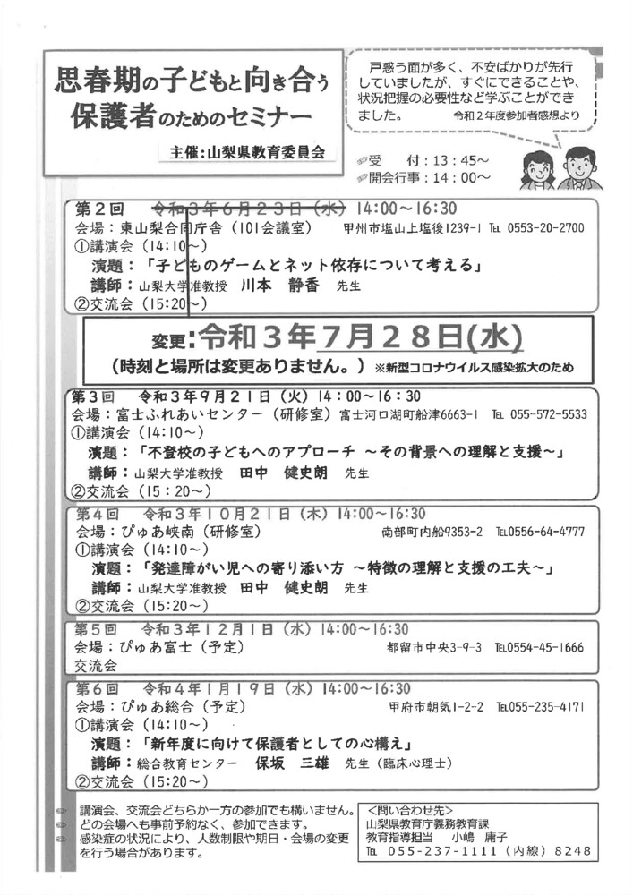 山梨県教育委員会が主催する『思春期の子供と向き合う保護者のためのセミナー』について