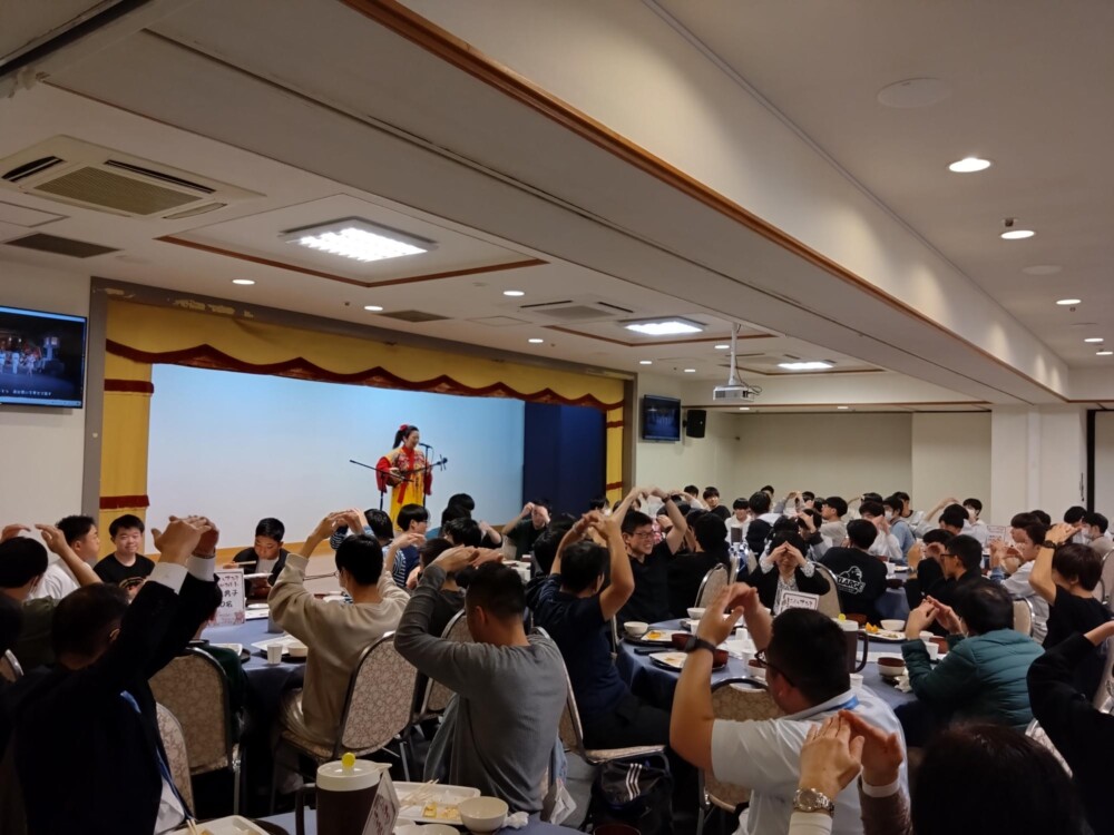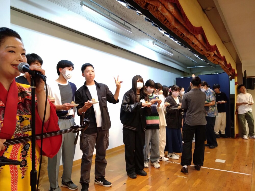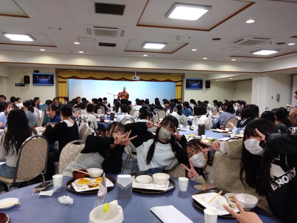 夕食で三線の演奏でユイマールの振り付けをみんなで盛り上がる様子 夕食会場でピース