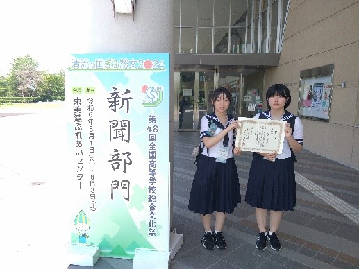 81日から4日まで本校新聞同好会の3年次生の濱尾なな羽さんと白鳥結衣さんが全国高校文化祭ぎふ大会に参加してきました。この大会は全国の県から推薦された新聞部を中心とする生徒が一同に会して表彰式などの式典や講演会、交流新聞作りを行うものです。