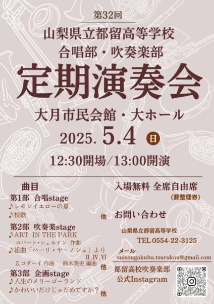 山梨県立都留高等学校 > わかつる日記 > 部活報告 > 合唱部・吹奏楽部 定期演奏会の開催 2025年4月23日カテゴリー: わかつる日記 部活報告 合唱部・吹奏楽部 定期演奏会の開催 今年度も合唱部・吹奏楽部合同で定期演奏会を開催します。 多くの皆様のご来場をお待ちしております。 (1)日時 令和7年5月4日(日) 12:30開場 13:00開演 (2)会場 大月市民会館大ホール (3)入場料 無料 ※全席自由席