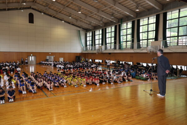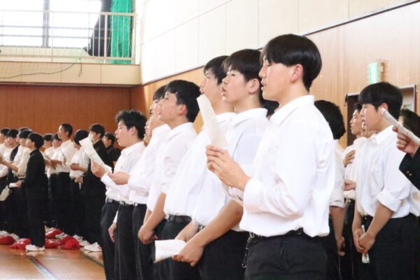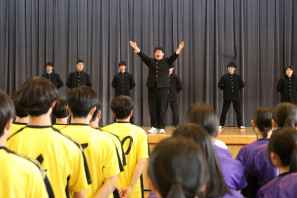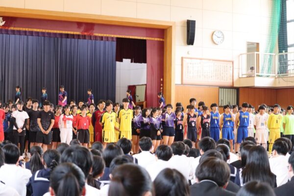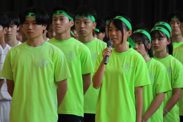 水泳、陸上、サッカー、男子バスケットボール、女子バスケットボール、女子バレーボール、男子ハンドボール、女子ハンドボール、男子テニス、女子テニス、男子バドミントン、女子バドミントン、柔道、剣道、ワンダーフォーゲル、卓球の各代表が総体に向けての抱負を述べました。応援団が運動部にエールを送りました。