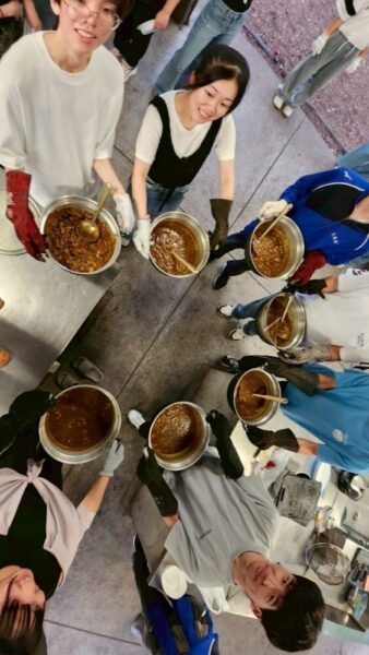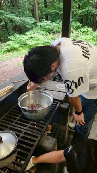 グループごとALTと会話をしながら木のスプーンをつくり、野外炊事でカレーを作りました。嫌いな野菜は小さく、水分多め・少なめ、班ごとに出来栄えは様々。ご飯も炊き加減がちょうどよく大成功!食材も残ることなくペロリと食べきりました。