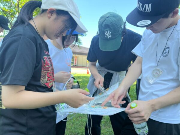 コンパスの使い方を教わり、各班で作戦立ててから出発です。東京ドーム10個分の敷地を駆け回り、汗だくでしたがとても清々しい顔をして帰ってきました。