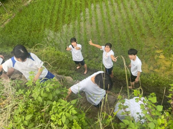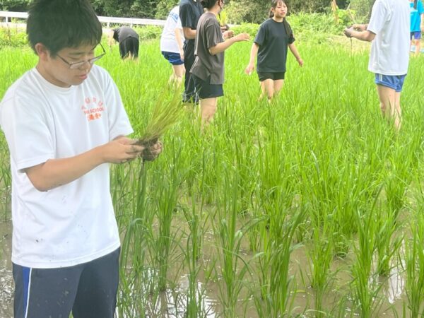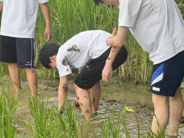 午後はBeyond自然塾で田んぼの雑草とりをお手伝いしてきました。田んぼに入るのが初めての生徒が多く、最初は戸惑っていましたが、足を突っ込んでしまえばどんどんと進んで行きました。道具を使ってみたり、イネを植えてみたり、虫を探してみたり、草取りしつつも楽しみ方も様々でした。最後はお決まりの泥んこ合戦。